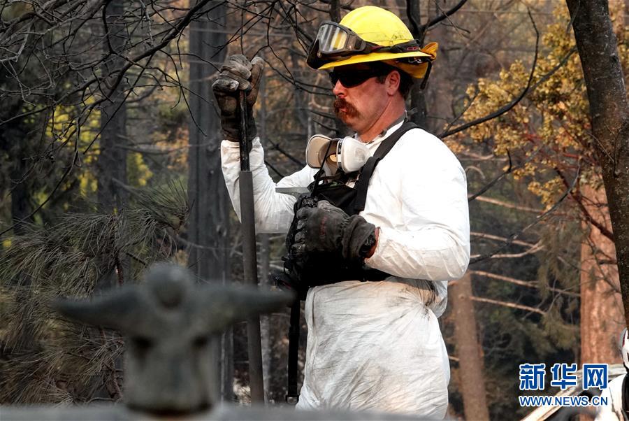 11月19日,在美国加利福尼亚州比尤特县天堂镇,救援人员在山火废墟中工作。新华社记者吴晓凌摄