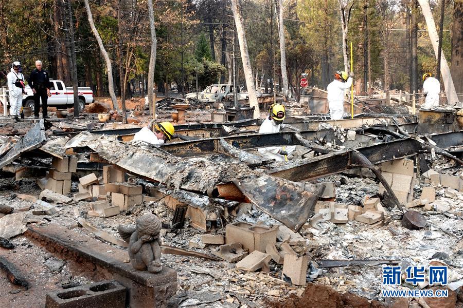 11月19日,在美国加利福尼亚州比尤特县天堂镇,救援人员在山火废墟中工作。新华社记者吴晓凌摄