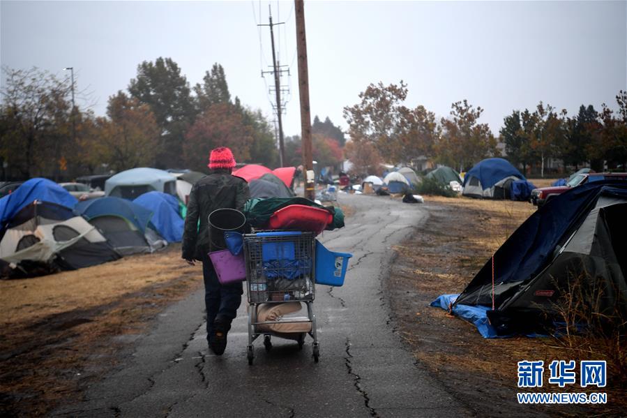11月21日,在美国加利福尼亚州比尤特县奇科,灾民在沃尔玛停车场推车前行。 新华社记者吴晓凌摄