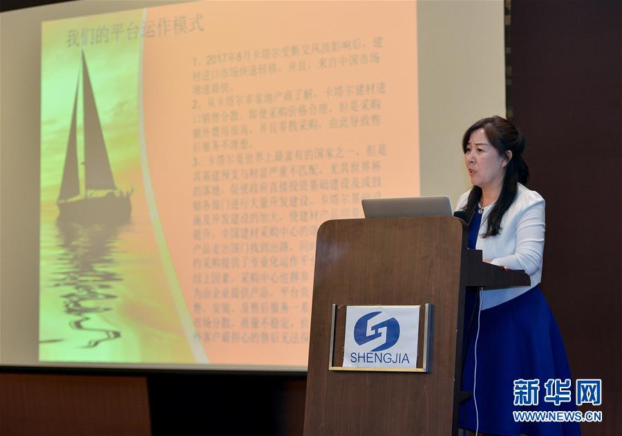 11月21日,在卡塔尔首都多哈,山东晟佳国际贸易有限公司董事长彭红在洽谈会上发言。