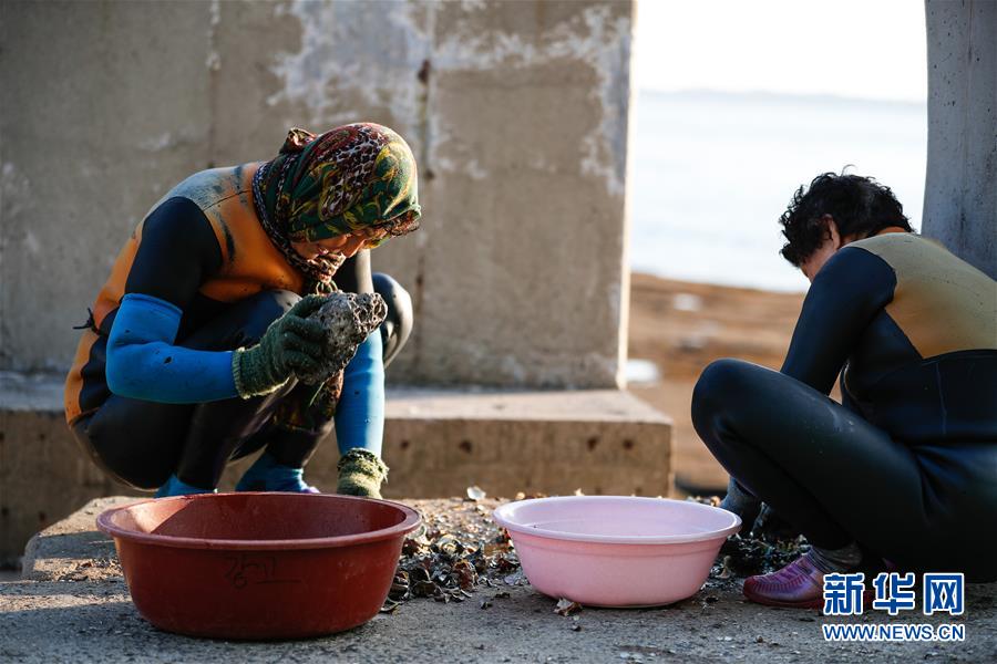 11月23日,海女们在韩国济州岛的一处海岸附近处理打捞出的海产品。新华社记者 王婧嫱 摄