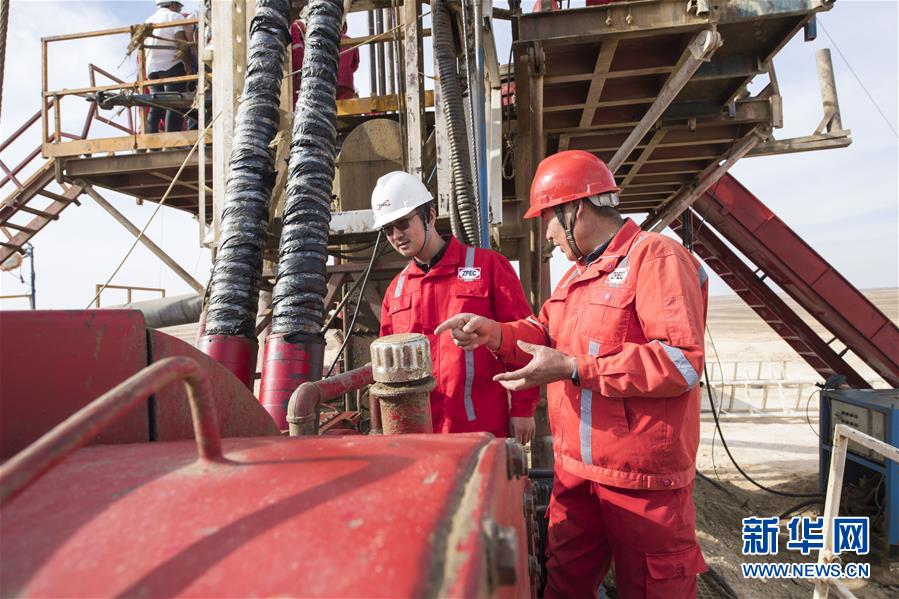 11月20日,在埃及明亚省,中曼石油埃及分公司总经理李伟(左)在钻井现场查看。 2017年,中国中曼石油公司与阿联酋海湾集团签订合同,为该集团在埃及沙漠中的大型农业项目钻探300口水井。根据合同,中曼石油将先期完成30口井的试钻探,剩余水井将以每月7口的速度交付。目前有超过200名工人在钻井现场作业,大部分是埃及本地人。 新华社记者李碧念摄