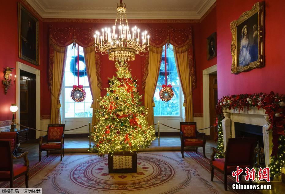 当地时间2018年11月26日,美国华盛顿,2018年白宫圣诞装饰预展举行,圣诞装饰布满,宛如童话世界。