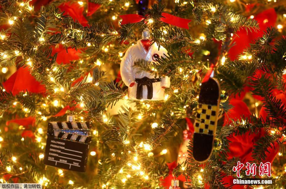当地时间2018年11月26日,美国华盛顿,2018年白宫圣诞装饰预展举行,圣诞装饰布满,宛如童话世界。