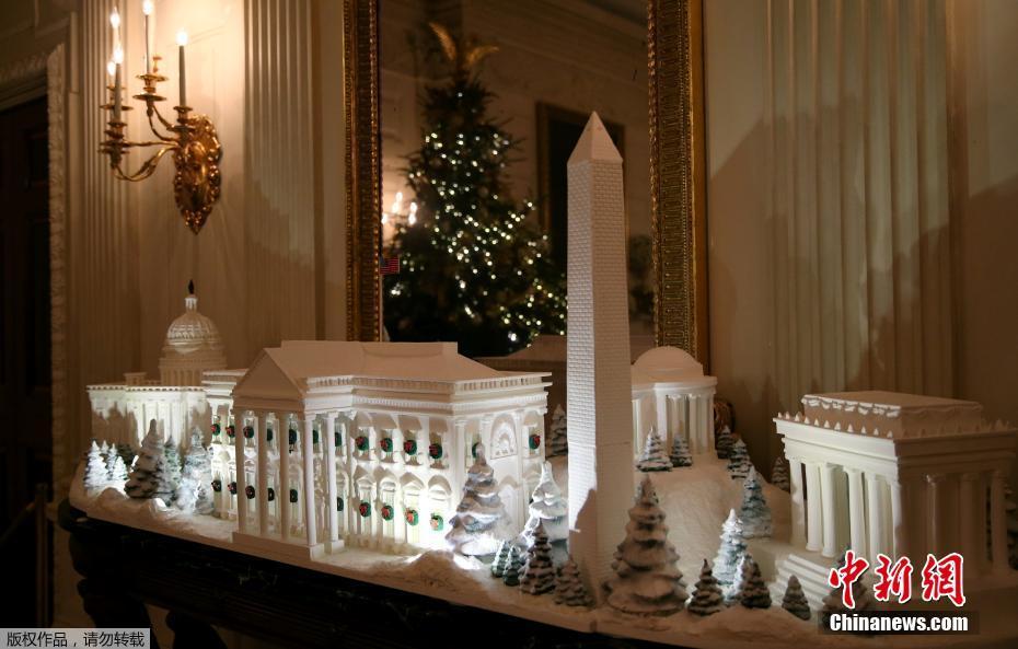当地时间2018年11月26日,美国华盛顿,2018年白宫圣诞装饰预展举行,圣诞装饰布满,宛如童话世界。