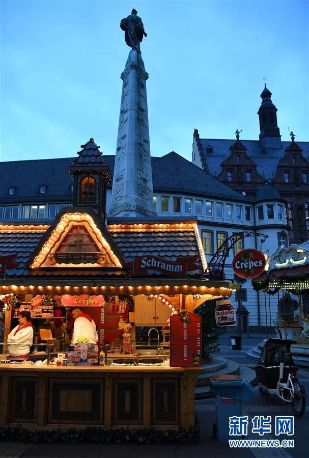11月26日,在德国法兰克福圣诞市场,一间商铺准备开张。 新华社记者逯阳摄