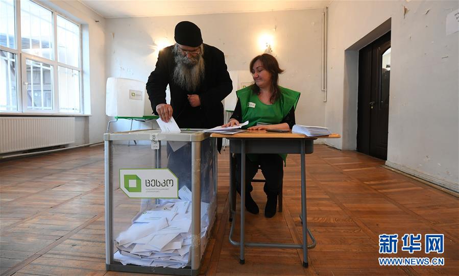 11月28日,在格鲁吉亚首都第比利斯,一名选民(左)在投票站参加投票。 新华社发(塔穆娜摄)