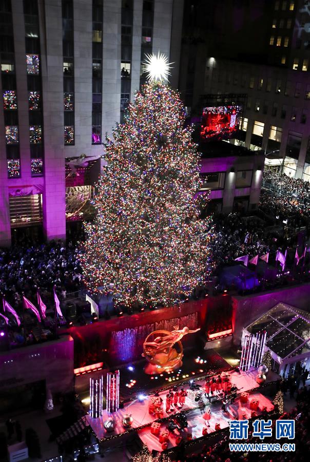 11月28日,演员在美国纽约洛克菲勒中心点亮圣诞树仪式上表演。 新华社记者王迎摄