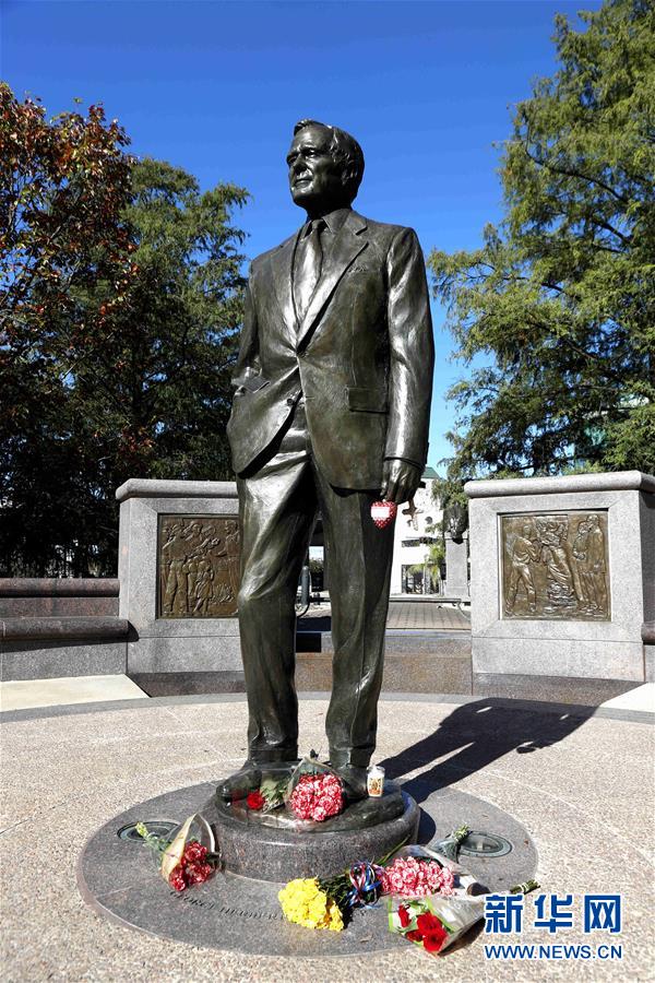 12月1日,在美国休斯敦,美国前总统乔治·赫伯特·沃克·布什的雕像前摆放着鲜花和蜡烛。
