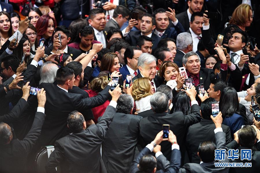 12月1日,在墨西哥首都墨西哥城,安德烈斯·曼努埃尔·洛佩斯·奥夫拉多尔(中)在总统权力交接仪式前与支持者互动。 当日,墨西哥当选总统安德烈斯·曼努埃尔·洛佩斯·奥夫拉多尔从恩里克·培尼亚·涅托手中接任总统一职,正式成为墨西哥总统。 新华社记者辛悦卫摄