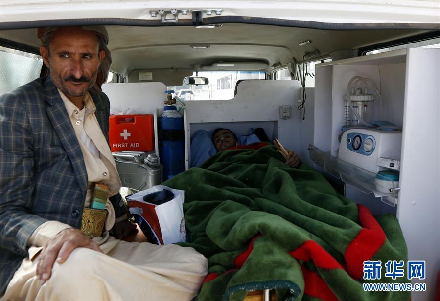 12月3日,一名胡塞武装伤员乘救护车抵达也门萨那国际机场,准备前往国外治疗。 新华社发(穆罕默德摄)