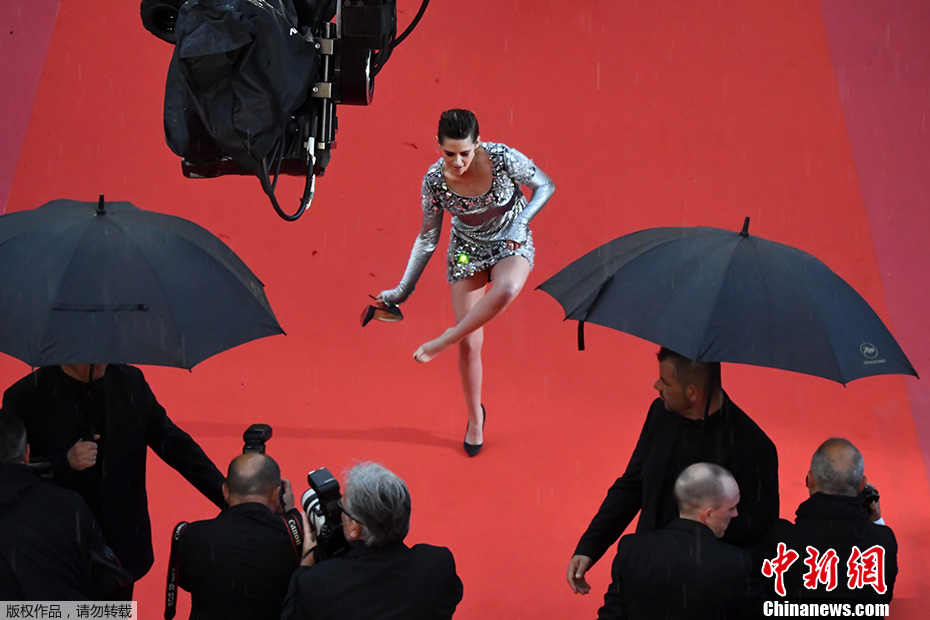 当地时间2018年5月14日,第71届戛纳电影节上,美国女演员、故事片评审团成员克里斯汀·斯图尔特在红地毯上脱下高跟鞋。Antonin THUILLIER