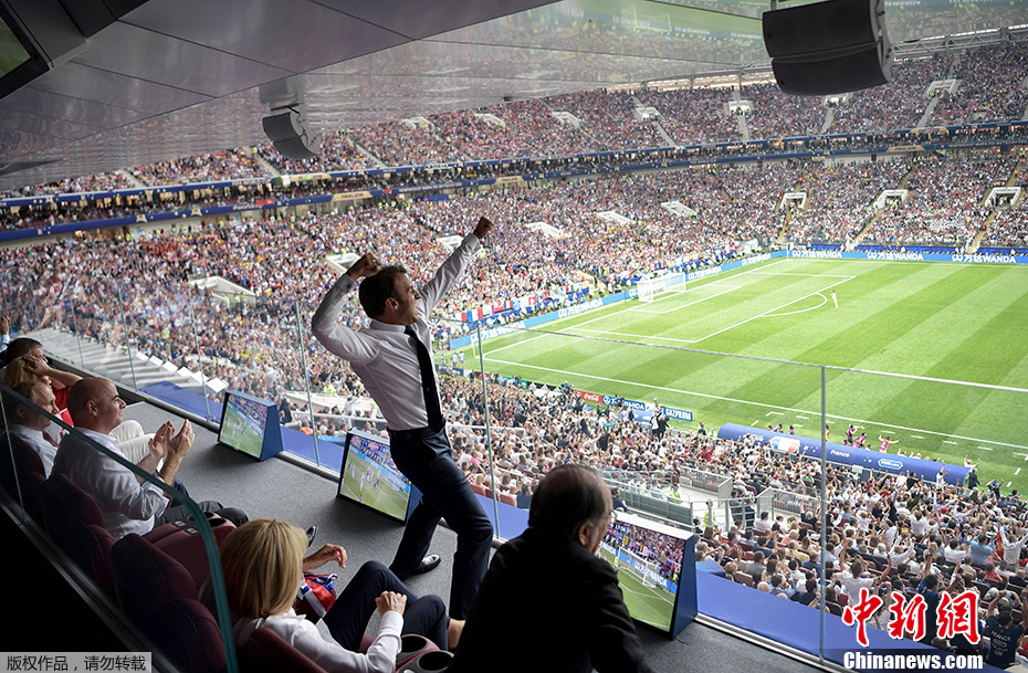 当地时间2018年7月15日,俄罗斯莫斯科卢日尼基体育场举行2018年世界杯决赛,法国总统马克龙庆祝法国队夺冠。Alexey NIKOLSKY