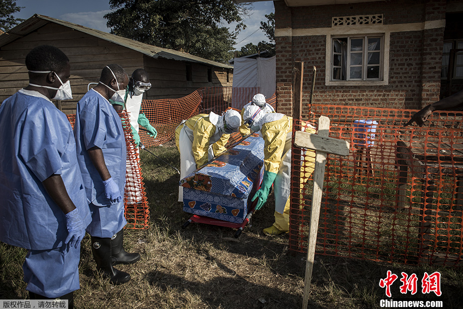 当地时间2018年8月13日,刚果(金)贝宁,国际医疗行动联盟(ALIMA)运营的埃博拉治疗中心医护人员正在为一名未确诊的埃博拉患者的棺材消毒。John WESSELS