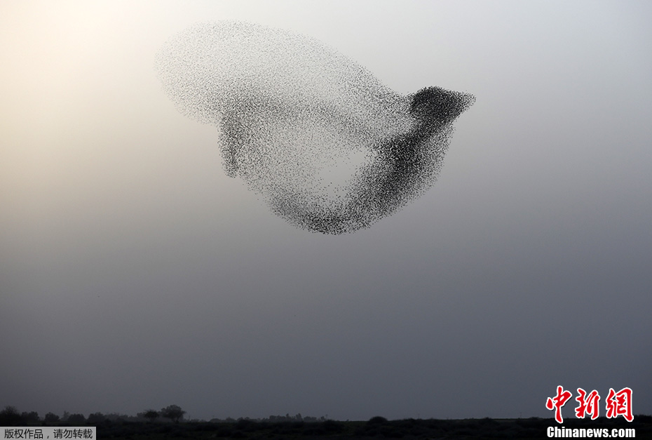当地时间2018年1月22日,以色列拉哈特,聚集的椋鸟群在天空飞舞,场面壮观。MENAHEM KAHANA