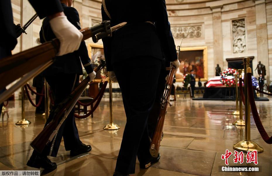 灵柩由一支军事仪仗队抬入圆形大厅,安置在1865年为林肯总统的棺材所建造的灵柩台上。