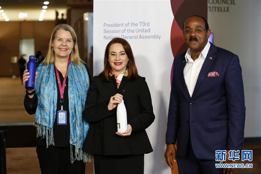 12月4日,在位于纽约的联合国总部,挪威常驻联合国副代表玛丽·斯卡勒、第73届联合国大会主席埃斯皮诺萨、安提瓜和巴布达总理加斯顿·布朗(从左至右)在新闻发布会后合影。 当日,第73届联合国大会主席埃斯皮诺萨正式宣布启动全球反塑料污染行动。 新华社记者李木子摄