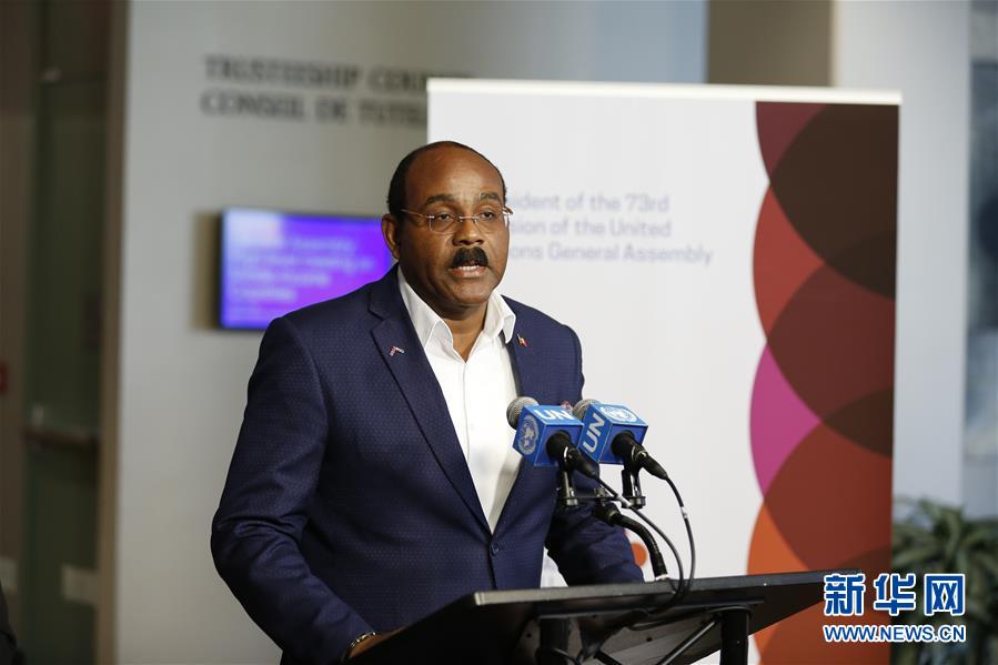 12月4日,在位于纽约的联合国总部,安提瓜和巴布达总理加斯顿·布朗在启动全球反塑料污染行动新闻发布会上讲话。 当日,第73届联合国大会主席埃斯皮诺萨正式宣布启动全球反塑料污染行动。 新华社记者李木子摄