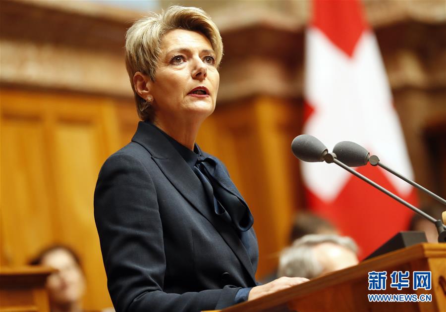 12月5日,在瑞士首都伯尔尼,新当选的瑞士联邦委员会成员卡琳·凯勒-祖特尔在议会上发表讲话。 新华社发(鲁本·斯布里奇摄)