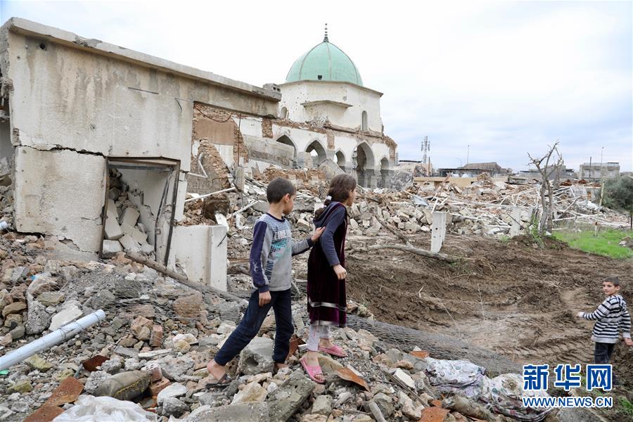 12月6日,在伊拉克摩苏尔老城区,几个孩子在努里清真寺的废墟旁玩耍。 新华社发(哈利勒·达伍德摄)
