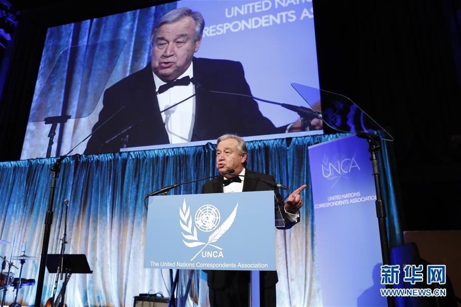 12月5日,在美国纽约,联合国秘书长古特雷斯在晚宴上讲话。 联合国记者协会5日晚在纽约曼哈顿举办一年一度的盛大颁奖晚宴,联合国秘书长古特雷斯及联合国官员、各国驻联合国使节、常驻联合国记者和各界代表等约600人出席。今年的全球倡导者奖由两人共同获得,成为当天晚宴的最大亮点。 新华社记者 李木子 摄