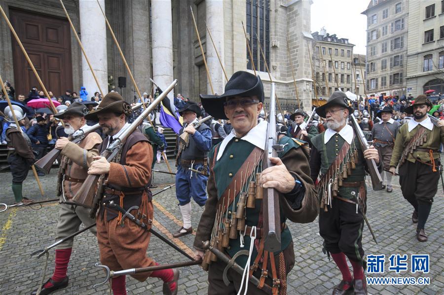 12月8日,在瑞士日内瓦,人们身着17世纪服饰在老城参加登城节活动。