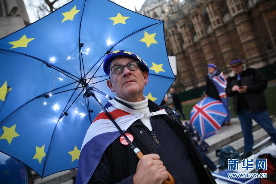 12月10日,在英国伦敦,反对“脱欧”协议的民众在议会大厦外示威。 新华社发(乔·纽曼摄)