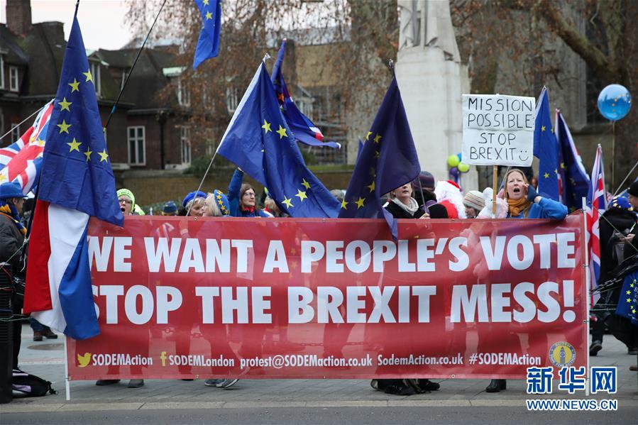 12月10日,在英国伦敦,反对“脱欧”协议的民众在议会大厦外示威。 新华社发(乔·纽曼摄)