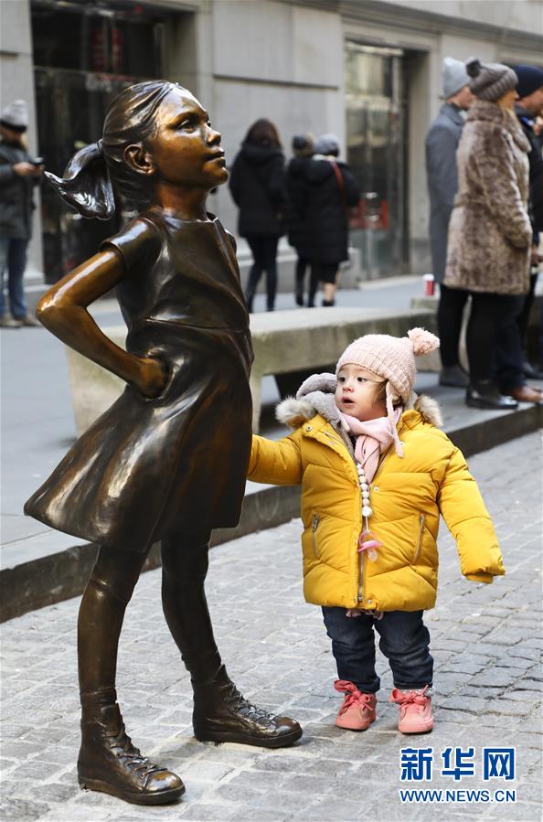 12月10日,在美国纽约,一名小女孩端详纽约证券交易所前的“无畏女孩”铜像。 新华社记者 王迎 摄