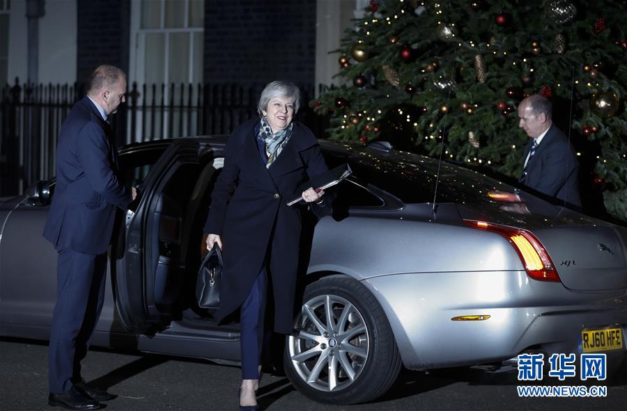 12月12日,在英国伦敦,英国首相特雷莎·梅(中)在不信任投票后返回首相府。 英国首相特雷莎·梅12日晚在保守党对她举行的不信任投票中过关,留任保守党领袖及英国首相。 新华社记者 韩岩 摄