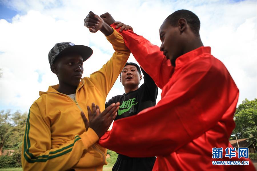 2014年12月10日,在肯尼亚内罗毕肯雅塔大学,马玉龙(中)在指导弟子的武术动作。