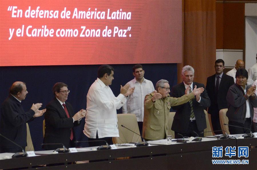 12月14日,在古巴哈瓦那,古巴共产党中央委员会第一书记劳尔·卡斯特罗(前排左四)、古巴国务委员会主席兼部长会议主席迪亚斯-卡内尔(前排左五)和委内瑞拉总统马杜罗(前排左三)等联盟成员国元首、政府首脑或代表出席峰会。 第16届美洲玻利瓦尔联盟峰会14日在古巴首都哈瓦那举行,会议呼吁加强拉丁美洲及加勒比地区团结,推进地区一体化。 新华社发(华金·埃尔南德斯 摄)