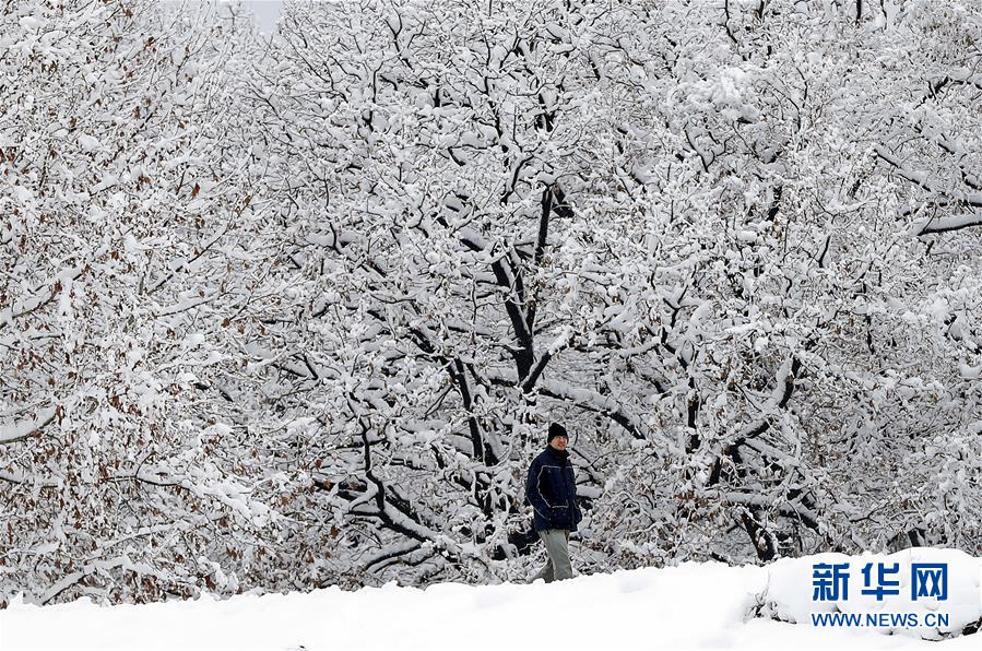 12月16日,在塞尔维亚贝尔格莱德,一名男子在积雪上行走。