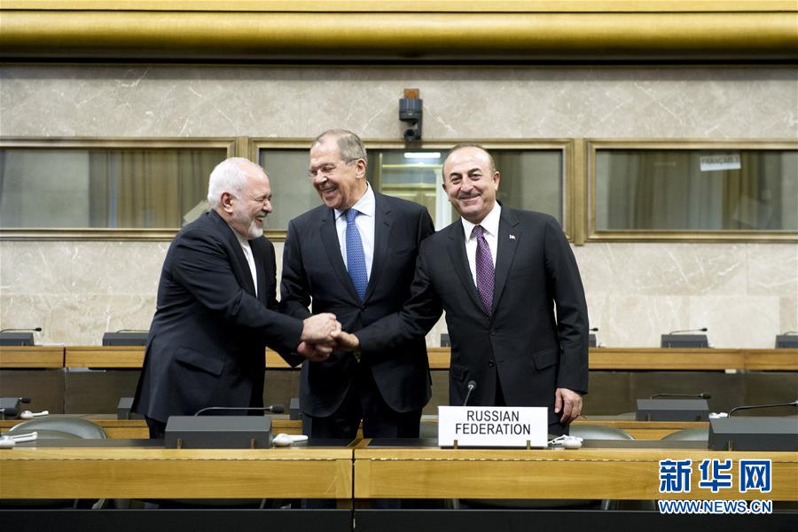 12月18日,在瑞士日内瓦,俄罗斯外长拉夫罗夫(中)、土耳其外长恰武什奥卢(右)和伊朗外长扎里夫在会谈结束后握手。新华社发(维奥莱纳摄)