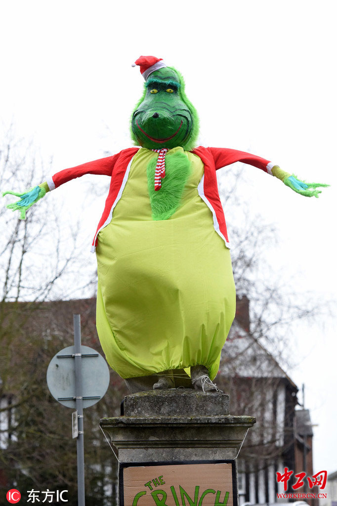 英国村庄勋爵雕塑年年圣诞遭恶搞-今年变身绿毛怪2