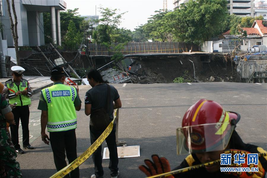 12月19日,在印度尼西亚泗水市,警方在塌陷事故现场执勤。 新华社发(库尔尼亚万摄)