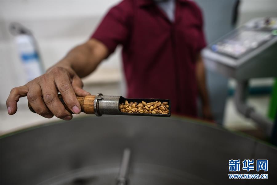 12月19日,在哥斯达黎加阿拉胡埃拉省,一个咖啡种植园的工作人员展示正在进行烘焙的咖啡豆。 新华社记者 辛悦卫 摄