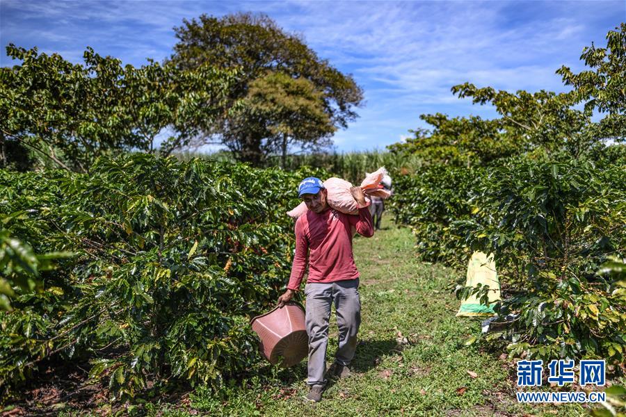 12月19日,在哥斯达黎加阿拉胡埃拉省的一个咖啡种植园,工作人员正在搬运刚刚采摘的咖啡果实。 新华社记者 辛悦卫 摄