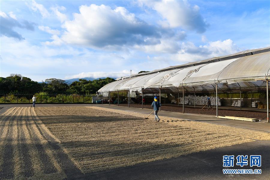 12月18日,在哥斯达黎加阿拉胡埃拉省的一个咖啡种植园,工作人员在咖啡晾晒场作业。 新华社记者 辛悦卫 摄