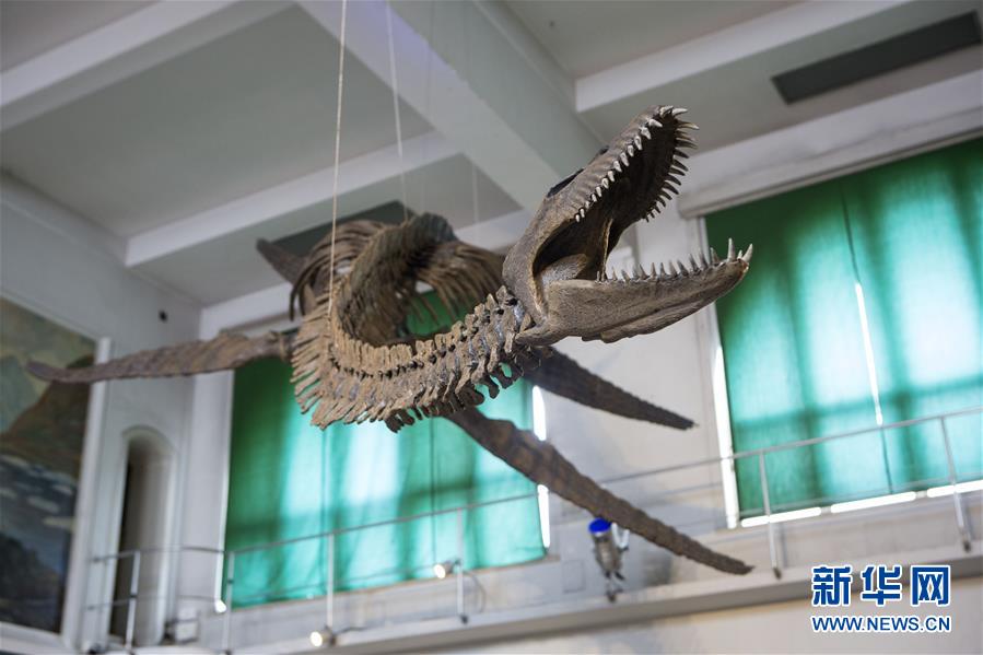 当日,一具蛇颈龙骨架化石的复制品在阿根廷自然科学博物馆亮相。这具罕见的蛇颈龙骨架化石于2009年在阿根廷南部被发现,阿根廷古生物学家及技术人员随后花费了9年的时间对其进行发掘和修复。
