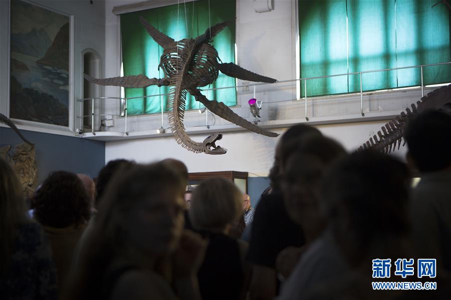 12月19日,观众在阿根廷自然科学博物馆参观蛇颈龙骨架化石的复制品。