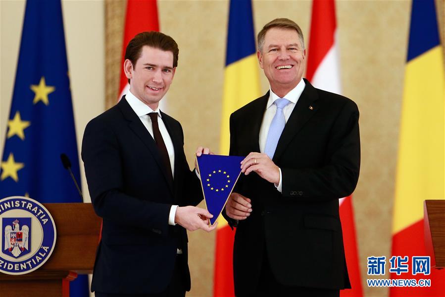 12月21日,在罗马尼亚布加勒斯特,罗马尼亚总统约翰尼斯(右)与来访的奥地利总理库尔茨手持欧盟的旗帜合影。 罗马尼亚总统约翰尼斯21日在与来访的奥地利总理库尔茨会晤后举行的联合记者会上说,希望英国能够在明年上半年、罗马尼亚担任欧盟轮值主席国期间有条不紊地完成“脱欧”进程。 新华社发(克里斯泰尔摄)