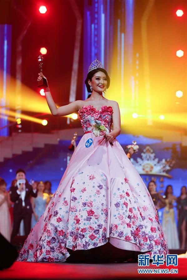 12月23日,荣膺桂冠的蒙古国选手钢·苏德格日勒展示奖杯。 当日,第十五届中俄蒙美丽使者国际大赛在满洲里落幕,来自中国、俄罗斯、蒙古国的60名选手角逐总决赛。 新华社记者 虞东升 摄