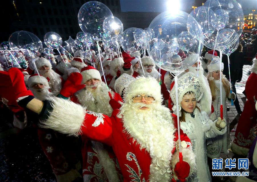 12月24日,在白俄罗斯首都明斯克,人们装扮成“严寒老人”和“雪姑娘”参加新年巡游。 新华社发(马祖列维奇摄)