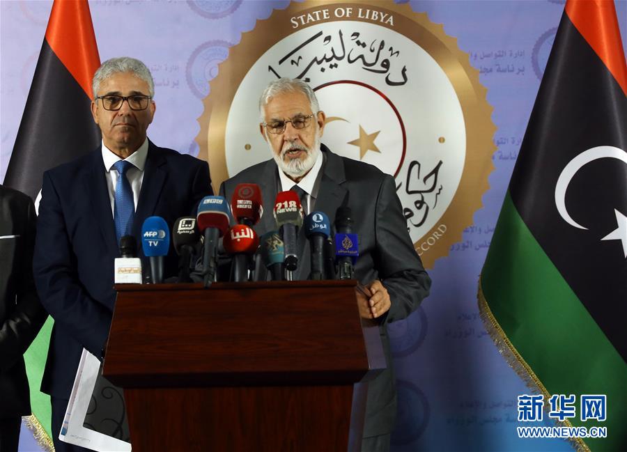 12月25日,在利比亚首都的黎波里,利比亚民族团结政府外长西亚拉(右)谴责针对利外交部的袭击。 当日,位于利比亚首都的黎波里的利民族团结政府外交部遭到袭击,造成至少两人死亡。 新华社发
