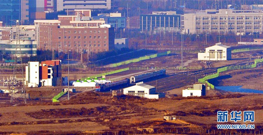 12月26日,搭载韩方代表团成员的特别列车(中左)抵达朝鲜开城市板门站。 据韩国统一部26日确认,韩国和朝鲜当天上午10时(北京时间9时)左右在位于朝鲜开城市的板门站举行京义线和东海线铁路及公路连接工程动工仪式。 新华社发(韩朝铁路公路动工仪式韩方联合采访团供图)