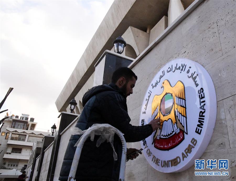 12月27日,在叙利亚大马士革,一名工作人员擦拭阿拉伯联合酋长国驻叙利亚大使馆的标志。 当日,位于大马士革的阿拉伯联合酋长国驻叙利亚大使馆在关闭近7年后重新开放。阿联酋是多年来首个在叙利亚重新开放大使馆的海湾阿拉伯国家合作委员会(海合会)成员国。 新华社发(阿马尔 摄)