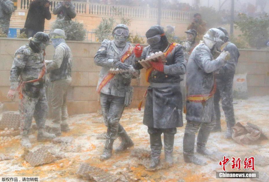 西班牙迎来一年一度“面粉节” 民众互掷面粉鸡蛋