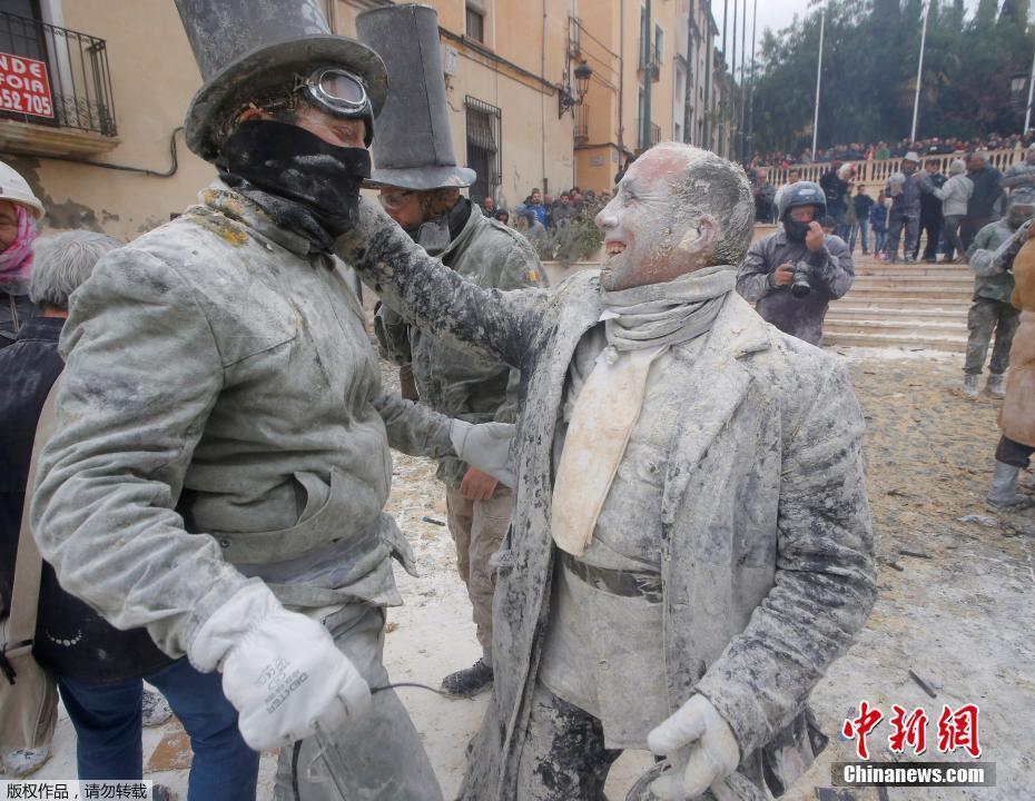 西班牙迎来一年一度“面粉节” 民众互掷面粉鸡蛋