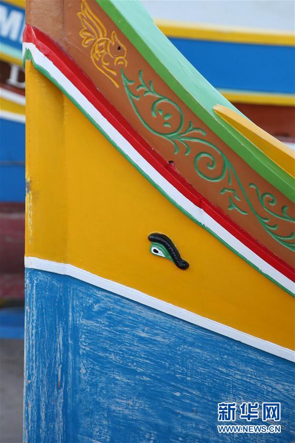 这是12月30日在马耳他南部渔村马尔萨什洛克码头拍摄的一艘鲁佐的船头。 新华社记者袁韵摄